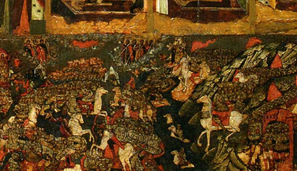 Дело в том, что оба войска идут на битву друг с другом под одними и теми же знаменами. На них изображен "Спас нерукотворный".