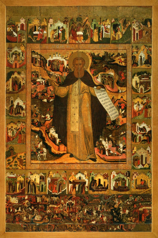 Как ясно из названия, икона эта отражает основные этапы жизненного пути преподобного. В контексте рассматриваемого вопроса наиболее интересна ее нижняя часть.